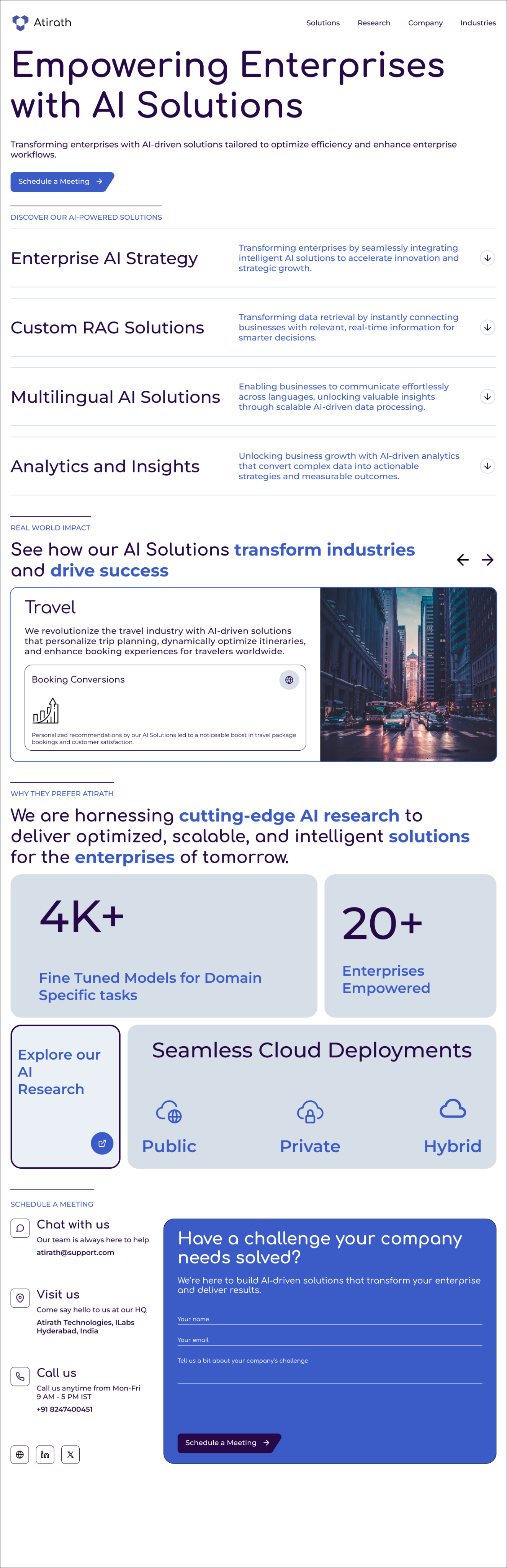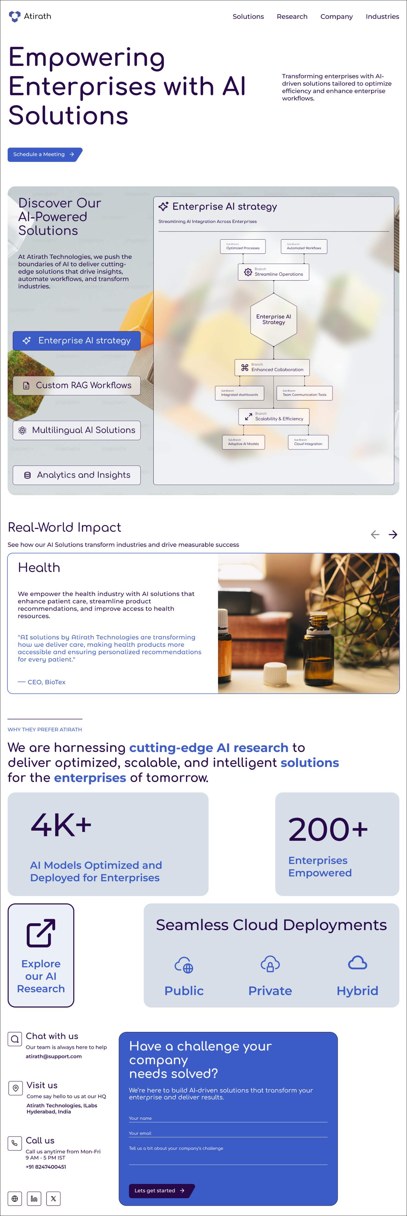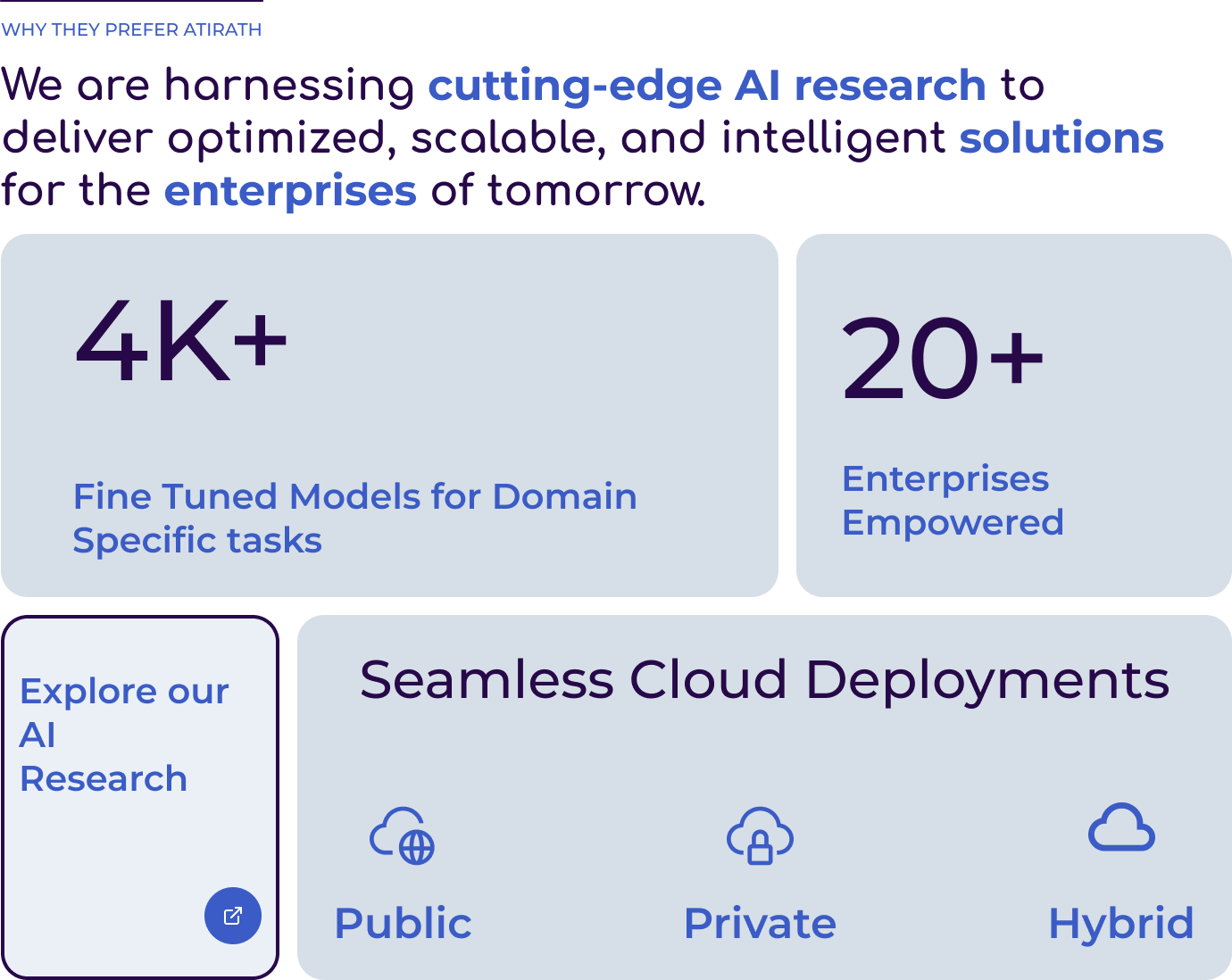 A credibility section highlighting Atirath’s AI research strengths, key performance metrics, and flexible deployment options, paired with a call-to-action to explore further.