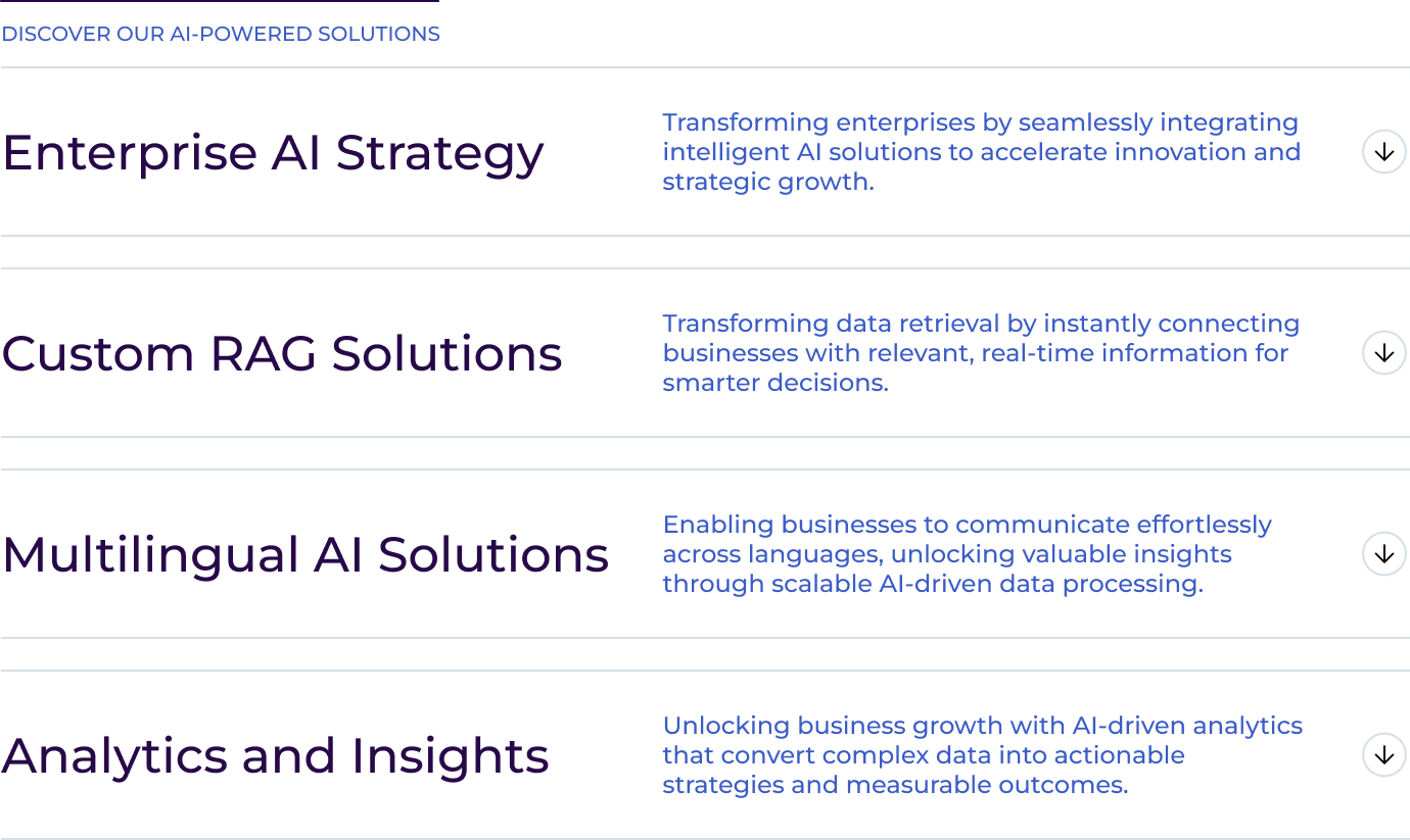 Expandable list of AI-powered solutions with deeper insights for each